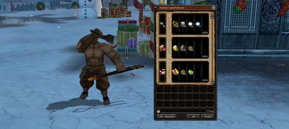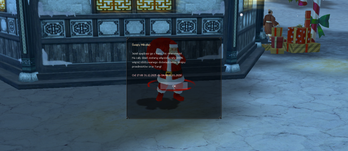NismoGT Posted December 13, 2025 Share Posted December 13, 2025 Święta 2025 czas zacząć! Drodzy Nerwijczycy, to już nasze 5 wspólne święta. Dziękujemy że od tylu lat jesteście z nami! Przygotowaliśmy dla was prezentację tegorocznego wydarzenia świątecznego. Mamy nadzieję że wam się spodoba ❤️ Start wydarzenia: 15 Grudnia, o godzinie 18:00. Zakończenie: 5 Stycznia, o godzinie 23:59. Zaczynajmy! Pierwsze co rzuci Nam się w oczy, to piękny wygląd miast pierwszych. Miasto Jinno. Miasto Shinsoo. Kamienie Metin na czas trwania wydarzenia, również zmieniły wygląd. Powrót Autorskiego Świątecznego Dungeonu! Najważniejsze informacje: -Miejsce wejścia: Miasta pierwsze, NPC Święty Mikołaj. 5 Przedziałów poziomowych wejścia: 35-55 poziom, czas do ponownego wejścia 30 minut. 56-76 poziom, czas do ponownego wejścia 60 minut. 77-97 poziom, czas do ponownego wejścia 90 minut. 98-120 poziom, czas do ponownego wejścia 120 minut. 121-130 poziom, czas do ponownego wejścia 150 minut. -Wymagana minimum 2 osobowa grupa, na każdy przedział poziomowy. -Działający bonus, silny przeciwko potworom. -Drop Świąteczna Skrzynia, oraz Prezent. -Na czacie wyświetli wam się instrukcja, odnośnie przebiegu Dungeonu. Przepustka na Dungeon Świąteczny. Kilka informacji: -Świąteczną Przepustkę zdobędziecie ze wszystkich Metinów, na zwykłych mapach, od poziomu 25. Przykładowa szansa na drop: Metin Zazdrości 35 poziom - szansa 14% na drop 1 sztuki. Metin Tu-Young - szansa 34% na drop 1 sztuki. Świąteczna Skrzynia. Kilka informacji: -Zdobędziecie ją w większych ilościach, tylko z Dungeonu Świątecznego. Przykładowy drop z 200 Świątecznych Skrzyń. Prezent Kilka informacji: -Możliwa do zdobycia tylko z głównego Bossa, na Świątecznym Dungeonie. -Zdobędziecie ją w mniejszej ilości, za to posiada cenniejsze przedmioty. Przykładowy drop z 200 Prezentów . Powrót rzutu śnieżkami! Kilka informacji: -Śnieżki kupimy u NPC Święty Mikołaj. -Czysta forma zabawy. Świąteczne Potworki Kilka informacji: -Nie mylcie ich z Bossami! To zwykłe, dodatkowe potworki, Troszeczkę mocniejsze od zwykłych mobów. -Zdobędziecie z nich drobne Upominki. Wojownik Mrozu -Poziom 40. -Miejsce występowania: Miasto 2 Jinno Miasto 2 Shinsoo Dolina Orków -Respi się w losowych miejscach na mapie. -Respi się po 10 sztuk na kanał. -Czas respu 5 minut. -Możliwość zdobycia, do 2 Upominków. Świąteczny Stwór -Poziom 60. -Miejsce występowania: Świątynia Hwang Pustynia Yongbi Góra Sohan -Respi się w losowych miejscach na mapie. -Respi się po 10 sztuk na kanał. -Czas respu 10 minut. -Możliwość zdobycia, do 3 Upominków. Lodowa Bestia -Poziom 80. -Miejsce występowania: Piekło Zwykły Las Czerwony Las -Respi się w losowych miejscach na mapie. -Respi się po 10 sztuk na kanał. -Czas respu 15 minut. -Możliwość zdobycia, do 4 Upominków. Mroźny Szaman -Poziom 105. -Miejsce występowania: Dolina Gnolli Smoczy Las -Respi się w losowych miejscach na mapie. -Respi się po 10 sztuk na kanał. Czas respu 20 minut. Możliwość zdobycia, do 5 Upominków. Śnieżna Bestia -Poziom 125. -Miejsce występowania: Mistyczna Dolina -Respi się w losowym miejscu na mapie. -Respi się po 10 sztuk na kanał. -Czas respu 25 minut. -Możliwość zdobycia, do 6 Upominków. Przykładowy drop z 200 Upominków. Nowe Kostiumy, Nakładki, Pety i Wierzchowce. To tylko niektóre z nich, wszystkie możecie obejrzeć sami. W oknie Item Shopu, na podglądzie 3D. Nowy Darmowy Item Shop! KOD #SOHAN Informacje: -Został wprowadzony nowy kod promocyjny #SOHAN. Który będzie działał, aż do 31 Stycznia. -Kodu może użyć każdy, stary i nowy gracz. -Stary kod #BERAN przestaje działać. -Aby użyć kodu, wystarczy wejść do okna IS i wybrać opcję "Kod Promocyjny". -Wartości Bonusów Darmowego Item Shopu są takie same, jak ze zwykłego IS. W skład darmowego zestawu IS wchodzą: -Kostium 1000 PŻ, Silny Przeciwko Potworom 10%, Silny Przeciwko Ludziom 10%. -Fryzura 1000 PŻ, Silny Przeciwko Potworom 10%, Silny Przeciwko Ludziom 10%. -Obie Nakładki *Np. Wojownik otrzyma nakładkę na Broń Jednoręczną i Dwuręczną* 70 Wartości Ataku, Silny Przeciwko Potworom 10%, Silny Przeciwko Ludziom 10%. -Szarfa Silny Przeciwko Potworom 10%, Wartość Ataku 55, Obrona 80. -Wierzchowiec Silny Przeciwko Potworom +20%, Szansa na Bonus DOŚ 30%, Punkty Doświadczenia 30%. -Pet 1500 PŻ, Silny Przeciwko Potworom +15%, Silny Przeciwko Ludziom +15%. Promocja +100% więcej SM, przy doładowaniu! Na czas trwania Wydarzenia Świątecznego 2025. Zostanie uruchomiona promocja +100% więcej SM. Skrzynia Premium. -Możliwość zdobycia unikatowych przedmiotów, takich jak Kostiumy, nakładki, fryzury na 60 dni i wiele więcej. Nowy Rok! Dla spędzających Sylwestra z Nerwia2: -Od godziny 17:00, do godziny 4:00. Zostaną aktywowane raty. 100% więcej zdobywanych exp, drop, yang! -Dodatkowo u Świętego Mikołaja zakupicie fajerwerki i śnieżki do zabawy. Dodatkowy Ekwipunek. -Nowe, dodatkowe miejsce na przechowanie naszych wspomagaczy i ich szybkie uruchomienie. -Początkowo każdy gracz będzie miał odblokowany 1 slot. -Aby odblokować resztę slotów musimy wytworzyć Klucz Uwolnienia. -Wytworzymy go u Kowala, w zakładce "Wytarzanie Magicznych Przedmiotów II" -Każdy klucz odblokowuje 1 slot. -Za pomocą przycisku F7 włączymy wspomagacze umieszczone w oknach. -Koszt wytworzenia 1 Klucza Uwolnienia w przeliczeniu wymaganych przedmiotów, to około 1 won. Słowami końcowymi chcieliśmy wam bardzo serdecznie podziękować, za to że jesteście z nami już 5 święta. Życzymy sobie i wam, abyśmy za kolejny rok spotkali się w takim samym gronie, bądź większym.❤️ Wesołych świąt i szczęśliwego nowego roku! 1 2 Link to comment Share on other sites More sharing options...